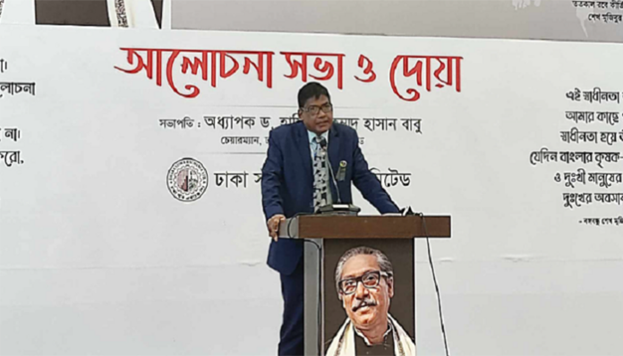 সোমবার (১৪ আগস্ট) জাতির জনক বঙ্গবন্ধু শেখ মুজিবুর রহমান, বঙ্গমাতা শেখ ফজিলাতুন্নেছা ও ১৫ আগস্টের সকল শহিদের প্রতি শ্রদ্ধা নিবেদনের জন্য রাজধানীর নিকুঞ্জে ডিএসইর নিজস্ব ভবনে অনুষ্ঠিত আলোচনা সভা ও দোয়া মাহফিলে শীর্ষক এক অনুষ্ঠানে সভাপতির বক্তব্যে ঢাকা স্টক এক্সচেঞ্জের (ডিএসই) চেয়ারম্যান অধ্যাপক ড. হাফিজ মুহম্মদ হাসান বাবু এসব কথা বলেন।