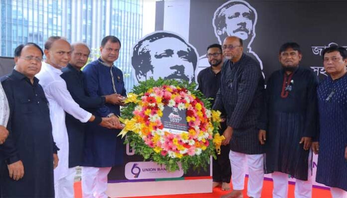 কর্পোরেট ডেস্ক: স্বাধীনতার মহান স্থপতি জাতির পিতা বঙ্গবন্ধু শেখ মুজিবুর রহমানের ৪৮তম শাহাদৎ বার্ষিকী ও জাতীয় শোক দিবস উপলক্ষে মঙ্গলবার (১৫ আগস্ট ২০২৩) ইউনিয়ন ব্যাংক লিমিটেড এর প্রধান কার্যালয়, গুলশান-১, ঢাকায় বঙ্গবন্ধুর প্রতিকৃতিতে পুষ্পস্তবক অর্পন করেন ব্যাংকের ব্যবস্থাপনা পরিচালক ও সিইওএ. বি. এম. মোকাম্মেল হক চৌধুরী।