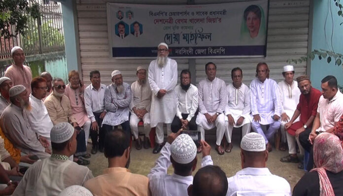 সাইফুল ইসলাম রুদ্র, নরসিংদী প্রতিনিধি: বিএনপির চেয়ারপার্সন সাবেক প্রধানমন্ত্রী বেগম খালেদা জিয়ার রোগমুক্তির জন্য নরসিংদীতে দোয়া ও মিলাদ মাহফিলের আয়োজন করা হয়েছে। আজ বুধবার সন্ধ্যায় নরসিংদী জেলা বিএনপির উদ্যেগে চিনিশপুর বিএনপির কার্যালয়ে এ মিলাদ ও দোয়া পড়ানো হয়। এ সময় খালেদা জিয়াকে উন্নত চিকিৎসার জন্য বিদেশে নেওয়ার দাবি জানানো হয়।