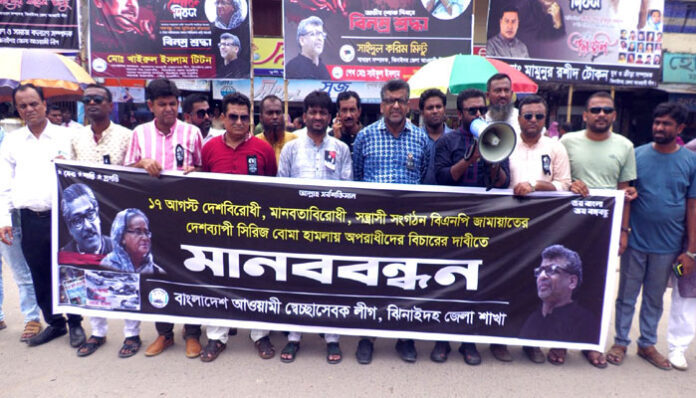 আতিকুর রহমান, ঝিনাইদহ প্রতিনিধিঃ সারাদেশে সিরিজ বোমা হামলায় জড়িতদের বিচারের দাবীতে ঝিনাইদহে মানববন্ধন কর্মসূচী পালিত হয়েছে। বৃহস্পতিবার সকালে শহরের পায়রা চত্বরে এ কর্মসূচীর আয়োজন করে জেলা স্বেচ্ছাসেবক লীগ। এতে ব্যানার ফেস্টুন নিয়ে সংগঠনটির জেলা শাখার নেতৃবৃন্দসহ উপজেলা শাখার নেতাকর্মীরা অংশ নেয়।