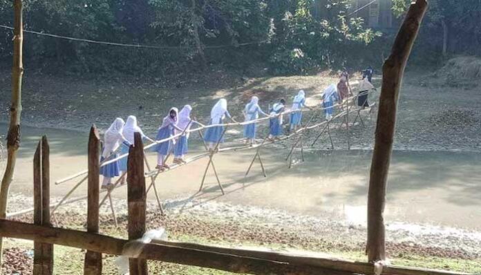 নড়বড়ে বাঁশের সাঁকো দিয়েই ঝুঁকি নিয়ে নদী পার হতে হচ্ছে এলাকাবাসীকে। আর এ অবস্থা চলে আসছে অর্ধশত বছরেরও বেশি সময় ধরে। স্থানীয়রা দীর্ঘদিন ধরে এখানে একটি ব্রিজ নির্মানের দাবি জানিয়ে আসছিলেন।