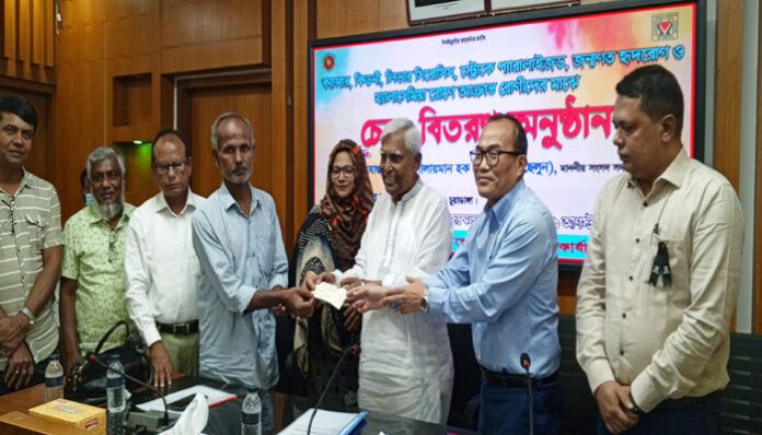 চুয়াডাঙ্গা-১ আসনের সংসদ সদস্য বীর মুক্তিযোদ্ধা সোলায়মান হক জোয়ার্দ্দার ছেলুন এমপি প্রাধান অতিথি হিসেবে উপস্থিত থেকে আক্রান্ত রোগীদের মাঝে চেক বিতরণ করেন।