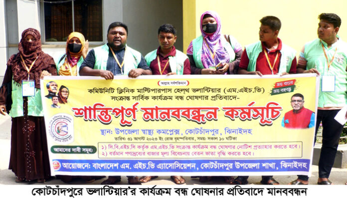 সেসময় বক্তারা বলেন, প্রান্তিক পর্যাযের জনগোষ্ঠীর স্বাস্থ্য সেবা পৌঁছানোর জন্য ২০২০ সালে প্রতিটি কমিউনিটি ক্লিনিকে কমিউনিটি ক্লিনিক মাল্টিপারপাস হেলথ ভলান্টিয়ার নিয়োগ দেওয়া হয়। যারা প্রতিটি গ্রামে বাড়িতে বাড়িতে গিয়ে স্বাস্থ্য সেবা প্রদাণ করে। ২০৩০ সাল পর্যন্ত চুক্তি থাকলেও এখন স্বাস্থ্য মন্ত্রনালয় তাদের সকল কার্যক্রম বন্ধ করে দিয়েছে। তাই বন্ধের নোটিশ প্রত্যাহার ও বেতন ভাতা বৃদ্ধির দাবী জানানো হয় মানববন্ধন থেকে।