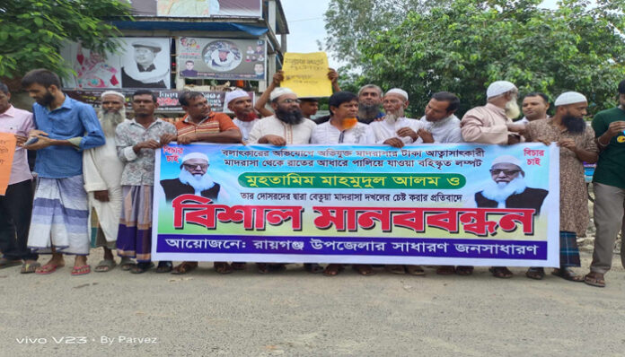 সেলিম রেজা, সিরাজগঞ্জ প্রতিনিধি: সিরাজগঞ্জের রায়গঞ্জে বলাৎকারের অভিযোগে অভিযুক্ত, মাদরাসার টাকা আত্বাসাৎকারী, মাদরাসা থেকে রাতের আধারে পালিয়ে যাওয়া বহিস্কৃত লম্পট মুহতামিম মাহমুদুল আলম ও তার দোসরদের দ্বারা বেতুয়া মাদরাসা দখলের চেষ্টা করার প্রতিবাদে মানববন্ধন অনুষ্ঠিত হয়েছে।