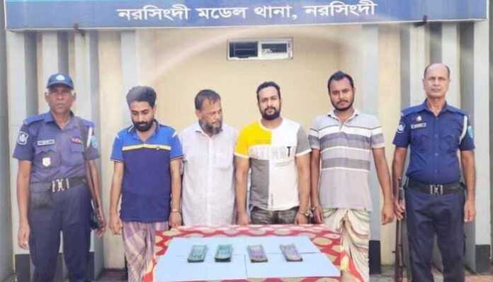 গ্রেপ্তারকৃতরা হলো, নরসিংদীর রায়পুরা থানার আমিরগঞ্জ গ্রামের মোবারক মিয়ার ছেলে মোঃ মাহবুব ভূইয়া (৩৩), সদর উপজেলার ভেলানগর এলাকার নজরল ইসলামের ছেলে হাবিব মিয়া (৩২), একই এলাকার আনোয়ার মাস্টার এর ছেলে মোঃ এরশাদ (৪৯) ও মনোহরদীর বড়চাপা এলাকার অজয় সাহার ছেলে প্রিতম সাহা (৩৩)।