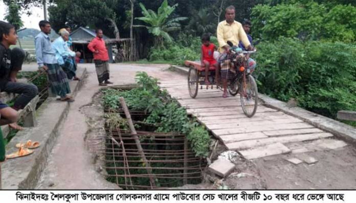 আতিকুর রহমান, ঝিনাইদহ প্রতিনিধিঃ ইট পাথর আর লোহার রড দিয়ে তৈরী ব্রীজটি এখন গ্রামবাসির মরণ ফাঁদে পরিণত হয়েছে। প্রায় ১০ বছর ধরে এই ব্রীজটি ভেঙ্গে চলাচলের অযোগ্য হয়ে পড়লে স্থানীয়রা টাকা উঠিয়ে কাঠ দিয়ে তালি মেরে চলাচল করছেন। এতে চলাচলে ঝুকি বাড়ছে। এদিকে এই ব্রীজ দিয়ে পারাপার হতে গিয়ে গ্রামের তিনজন মানুষ মারা গেছেন। আহত হয়েছেন কয়েকজন। লন্ডভন্ড এই ব্রীজটি ঝিনাইদহের শৈলকুপা উপজেলার গোলকনগর গ্রামে জিকে সেচ খালের উপর নির্মিত।