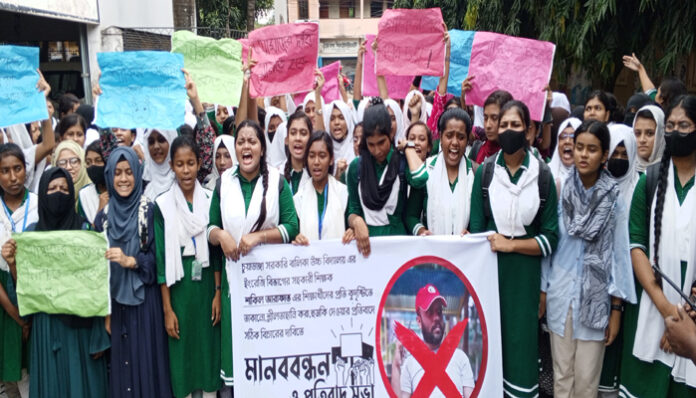 চুয়াডাঙ্গা প্রতিনিধি: চুয়াডাঙ্গায় ১০ম শ্রেণীর এক ছাত্রীকে শ্লীলতাহানীর ঘটনায় চুয়াডাঙ্গা সরকারি বালিকা উচ্চ বিদ্যালয় এর ইংরেজি সহকারী শিক্ষক শাকিল আরাফাত (৩৫) এর বহিষ্কার ও শাস্তির দাবিতে মানববন্ধন, অবস্থান কর্মসূচি ও বিক্ষোভ মিছিল করেছে বিদ্যালয়ের শিক্ষার্থীরা। মঙ্গলবার (১৯ সেপ্টেম্বর) সকাল ১০ টায় বিদ্যালয়ের সামনে মানববন্ধন শেষে বিক্ষোভ মিছিল শুরু করে জেলা প্রশাসকের কার্যালয়ে অবস্থান কর্মসূচি পালন করে আবার বিক্ষোভ মিছিল নিয়ে বিদ্যালয়ে গিয়ে শেষ হয়।