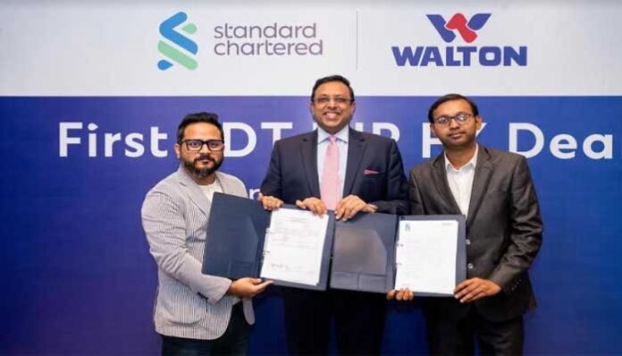 টাকা ও রুপিতে প্রথম আন্তঃসীমান্ত লেনদেন নিষ্পত্তি উপলক্ষে সোমবার (১৮ সেপ্টেম্বর, ২০২৩) রাজধানীর এক পাঁচতারকা হোটেলে স্ট্যান্ডার্ড চার্টার্ড ব্যাংক (এসসিবি) এবং ওয়ালটন হাই-টেক ইন্ডাস্ট্রিজ পিএলসি’র মধ্যে এক চুক্তি হয়। চুক্তিতে ওয়ালটন হাই-টেক ইন্ডাস্ট্রিজের ম্যানেজিং ডিরেক্টর ও সিইও গোলাম মুর্শেদ এবং এসসিবি’র সিইও নাসের ইজাজ বিজয় নিজ নিজ প্রতিষ্ঠানের পক্ষে স্বাক্ষর করেন।