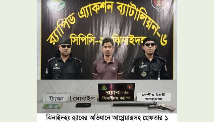 আতিকুর রহমান, ঝিনাইদহ প্রতিনিধি: ঝিনাইদহের শৈলকুপা উপজেলা বড়িয়া গ্রাম থেকে দেশীয় তৈরী আগ্নেয়াস্ত্রসহ ইমদাদুল মন্ডল (৪১) নামে এক ব্যক্তিকে আটক করেছে র্যাব-৬।