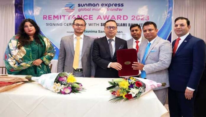 আমেরিকায় সানম্যান এক্সপ্রেস- এর উদ্যোগে রেমিট্যান্স এ্যাওয়ার্ড-২০২৩ প্রদান ও চুক্তি স্বাক্ষর অনুষ্ঠানে প্রধান অতিথি হিসেবে উপস্থিত ছিলেন সোশ্যাল ইসলামী ব্যাংকের পরিচালক মাহমুদুল আলম ও গেস্ট অব অনার হিসেবে উপস্থিত ছিলেন ব্যবস্থাপনা পরিচালক ও প্রধান নির্বাহী কর্মকর্তা জাফর আলম।