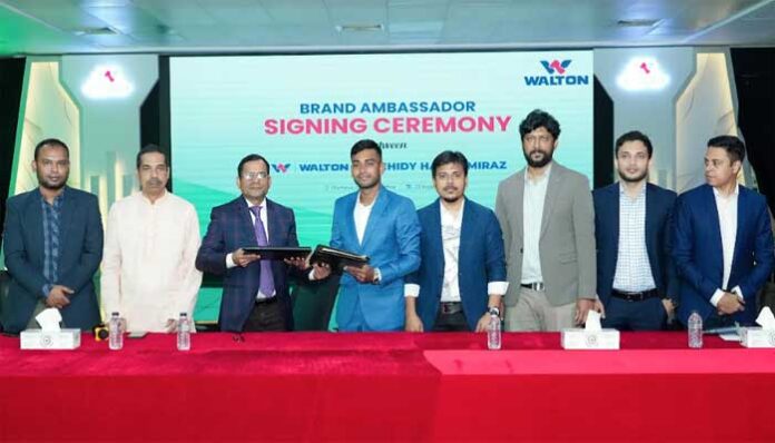 সম্প্রতি রাজধানীর বসুন্ধরায় ওয়ালটন করপোরেট অফিসে মিরাজ ও ওয়ালটনের মধ্যকার এ সংক্রান্ত চুক্তি স্বাক্ষরিত হয়। চুক্তিতে স্বাক্ষর করেন মেহেদী হাসান মিরাজ ও ওয়ালটন হাই-টেক ইন্ডাস্ট্রিজ পিএলসি’র ডেপুটি ম্যানেজিং ডিরেক্টর (ডিএমডি) নজরুল ইসলাম সরকার।