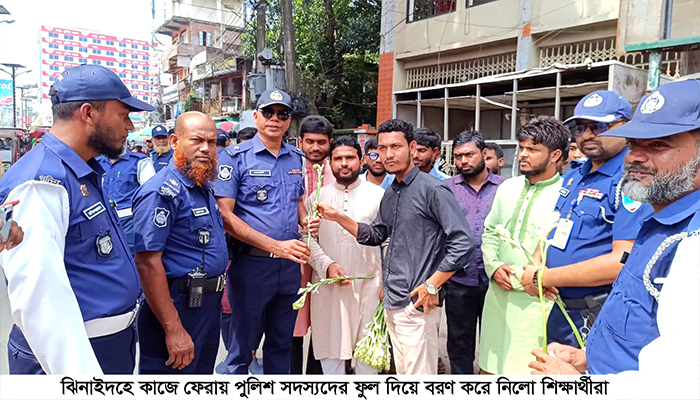 ঝিনাইদহ ট্রাফিক ইন্সপেক্টর মশিউর রহমান জানান, জেলার ৬ উপজেলার ৪০ টি গুরুত্বপূর্ণ স্থানে তারা কাজ শুরু করেছেন। এতে তাদের সহযোগীতা করছেন শিক্ষার্থীসহ রেডক্রিসেন্টের সদস্যরা। এদিকে কাজে ফেরায় পুলিশ সদস্যদের ফুল দিয়ে বরণ করে নেয় সাধারণ শিক্ষার্থীরা। দুপুরে ঝিনাইদহ শহরের পোস্ট অফিস মোড়ে কর্মরত পুলিশ সদস্যদের ফুল দিয়ে বরণ করে নেয় বৈষম্যবিরোধী আন্দোলনের কর্মীরা। এ সময় শিক্ষার্থীদের পক্ষে মেহেদি হাসান রাজু, আবরার জাহিন রনি, তানজিম বিন আলীম, মাসুদ রানা পারভেজ ও সাব্বির হোসাইনসহ ছাত্র সংগঠনের নেতারা উপস্থিত ছিলেন।