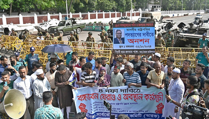 সরেজমিনে দেখা যায়, বঙ্গভবনের সামনে মোড়ে অবস্থান নিয়ে বিক্ষোভ ও বক্তব্য দিচ্ছেন স্বাধীনতা সার্বভৌমত্ব রক্ষা কমিটির ব্যানারে আসা নেতাকর্মীরা। পাশেই রাষ্ট্রপতির পদত্যাগের দাবিতে ‘রক্তিম জুলাই-২০২৪’ ব্যানারে দাঁড়িয়ে বিক্ষোভ করতে দেখা যায় অর্ধশত জনতাকে।