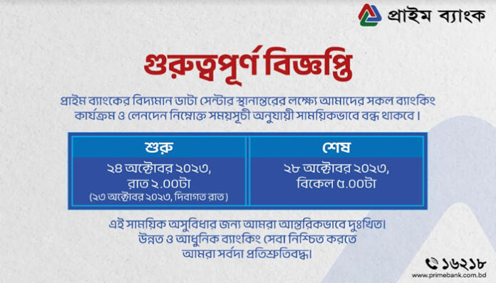 কর্পোরেট ডেস্ক: বাংলাদেশের অন্যতম শীর্ষস্থানীয় বাণিজ্যিক ব্যাংক, প্রাইম ব্যাংক-এর বিদ্যমান ডাটা সেন্টার স্থানান্তরের লক্ষ্যে আগামী ২৪ অক্টোবর রাত ২টা (২৩ অক্টোবর ২০২৩, দিবাগত রাত) থেকে ২৮ অক্টোবর ২০২৩ বিকাল ৫টা পর্যন্ত ব্যাংকের অনলাইন ও মোবাইল ব্যাংকিং, এটিএম পরিষেবা এবং ব্রাঞ্চ ব্যাংকিংসহ যেকোনো ডিজিটাল চ্যানেলে সকল ব্যাংকিং কার্যক্রম ও লেনদেন সাময়িকভাবে বন্ধ থাকবে।