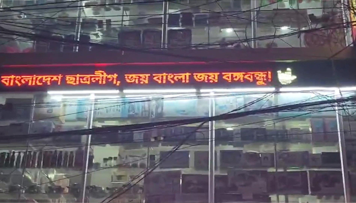 শেরপুর প্রতিনিধি: শেরপুর পৌর শহরের রঘুনাথ বাজার রোডে রাজ ক্রোকারিজ অ্যান্ড গিফট শপের ডিজিটাল সাইনবোর্ডে ভেসে উঠল ‘বাংলাদেশ ছাত্রলীগ, জয় বাংলা, জয় বঙ্গবন্ধু’। বুধবার রাত সাড়ে ৯টার দিকে এ ঘটনা ঘটে।