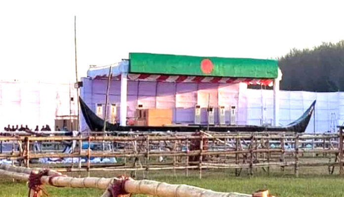 মহাসমাবেশের জন্য নৌকার আদলে তৈরি হচ্ছে মঞ্চ। আর এই মঞ্চকে বলা হচ্ছে স্মরণকালের সর্ববৃহৎ। লাল-সবুজ রঙে নৌকার আদলে ৮ ফুট উচ্চতার মঞ্চটির দৈর্ঘ্য হবে ১৩০ ফুট, আর প্রস্থ ৪৮ ফুট। প্রস্তুতি আর নিরাপত্তার অংশ হিসেবে মঞ্চের সামনে তৈরি হচ্ছে চার স্তরের ব্যারিকেড।