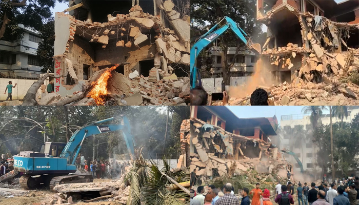 বৃহস্পতিবার (৬ ফেব্রুয়ারি) সকালেও এক্সকেভেটর দিয়ে বাড়িটি ভাঙছে বিক্ষুব্ধ ছাত্র-জনতা।