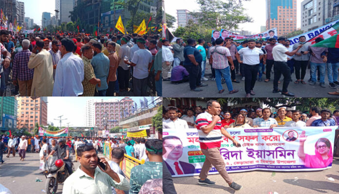 সরেজমিনে দেখা গেছে, পুরানা পল্টন, দৈনিক বাংলা, কমলাপুর, কাকরাইল, উইলস লিটল ফ্লাওয়ার স্কুল, মৎস ভবন, শাহজাহানপুর এলাকায় প্রধান সড়কগুলোতে মিছিল নিয়ে আসা নেতাকর্মীদের ব্যাপক উপস্থিতি রয়েছে। একইসঙ্গে আইনশৃঙ্খলা বাহিনীরা সর্তক অবস্থানে রয়েছে।