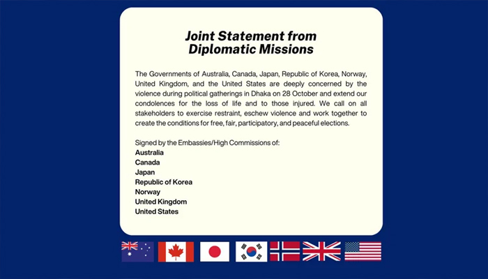 সোমবার (৩০ অক্টোবর) এক যৌথ বিবৃতি দেয় ঢাকার অস্ট্রেলিয়া, কানাডা, জাপান, কোরিয়া প্রজাতন্ত্র, নরওয়ে, যুক্তরাজ্য এবং যুক্তরাষ্ট্র দূতাববাস।