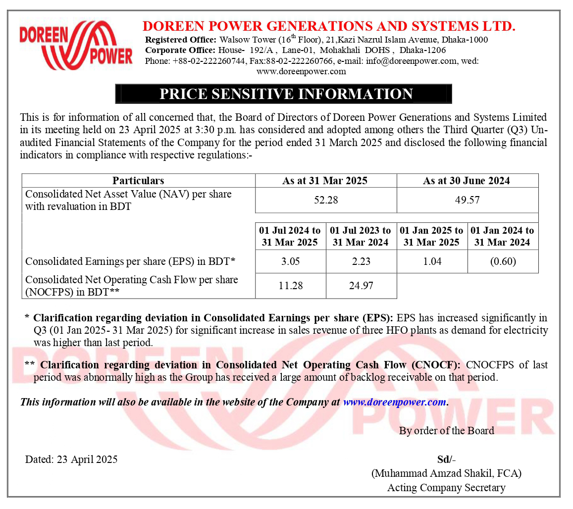 Homeপ্রাইস সেনসিটিভ ইনফরমেশন3rd Quarter Un-Audited Financial Statements of Doreen Power Generations and Systems Ltd.