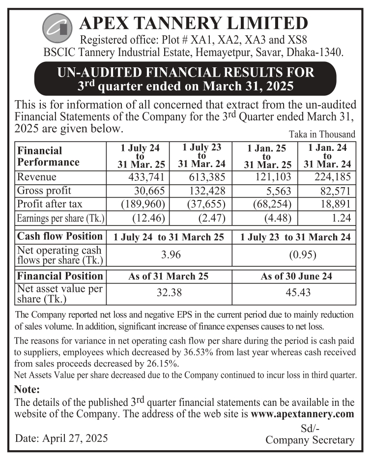 Homeপ্রাইস সেনসিটিভ ইনফরমেশন3rd Quarter Un-Audited Financial Statements of Apex Tannery Ltd.