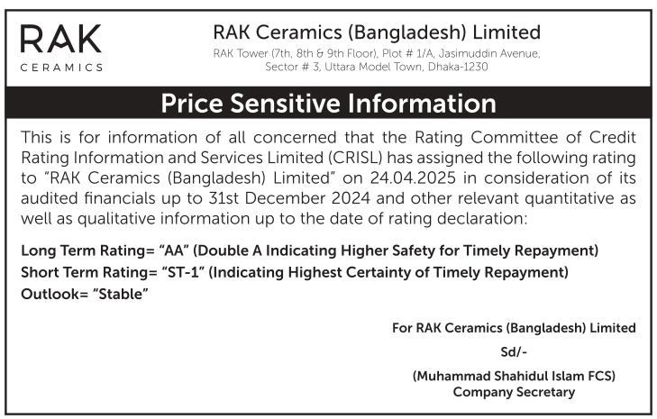Homeপ্রাইস সেনসিটিভ ইনফরমেশনPRICE SENSITIVE INFORMATION OF RAK Ceramics (Bangladesh) Ltd.