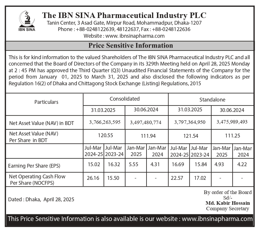 Homeপ্রাইস সেনসিটিভ ইনফরমেশন3rd Quarter Un-Audited Financial Statements of The IBN SINA Pharmaceutical Industry PLC