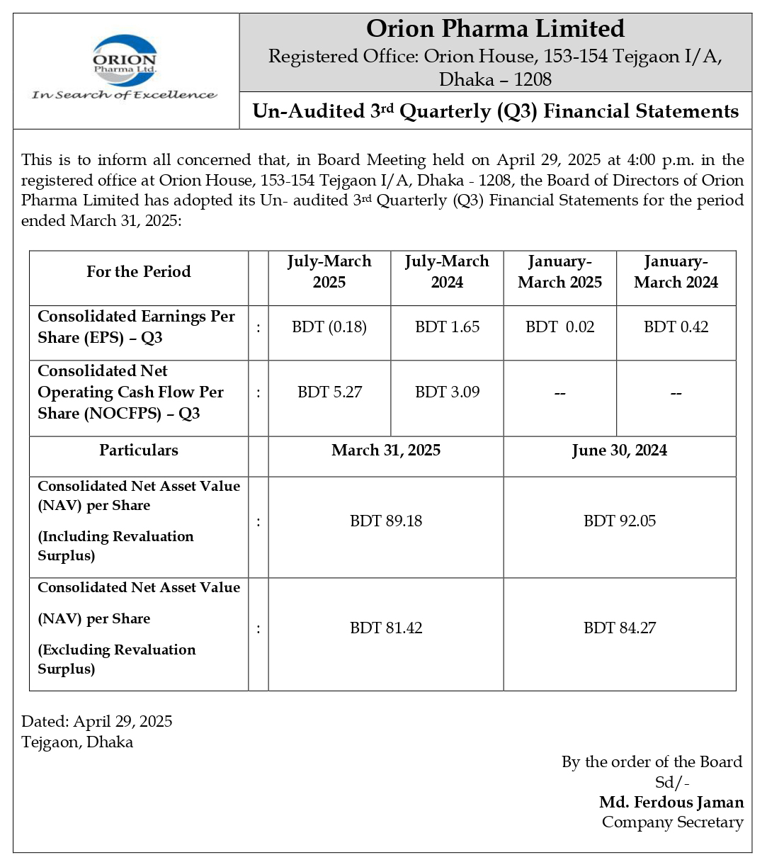 Homeপ্রাইস সেনসিটিভ ইনফরমেশন3rd Quarter Un-Audited Financial Statements of Orion Pharma Ltd.