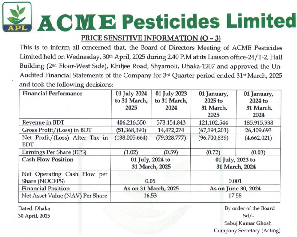 Homeপ্রাইস সেনসিটিভ ইনফরমেশন3rd Quarter Un-Audited Financial Statements of ACME Pesticides Ltd.