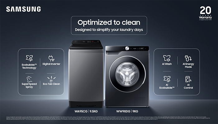 অন্যদিকে, ৯ কেজি ফ্রন্ট লোড ওয়াশারে রয়েছে এআই ওয়াশ, এআই ইকো বাবল, এআই কন্ট্রোল, স্মার্টথিংস কানেক্টিভিটি ও অটো ডিসপেন্স ফিচার। উদ্ভাবনী এ সব ফিচার কাপড় ধোয়ার প্রক্রিয়াকে করে তুলবে আরও কার্যকরী। ওয়াশিং মেশিনটিতে রয়েছে ১,৪০০-আরপিএম স্পিন স্পিড ও এনার্জি এফিশিয়েন্সি ক্লাস ‘এ’ এবং প্রতি সাইকেলে ওয়াশিং মেশিনটি ৫০ লিটার পানির ব্যবহার করবে; যে কারণে, এ ফ্রন্ট লোড ওয়াশারটি সাশ্রয় করবে পানি ও বিদ্যুৎ উভয়ই। স্টেক্লিন ড্রয়ার, হাইজিন স্টিম ও বাবল সোক-এর মতো চমৎকার ফিচার সমৃদ্ধ এ ওয়াশিংটি সহজেই যেমন কাপড়কে করে তুলবে আরও পরিষ্কার, তেমনি পুরো প্রক্রিয়া হবে আরও হাইজেনিক। পাশাপাশি, এর ঝকঝকে ব্ল্যাক কার্ভড ডোর ডিজাইন ওয়াশিং মেশিনটিকে দিয়েছে প্রিমিয়াম ও স্টাইলিশ লুক।