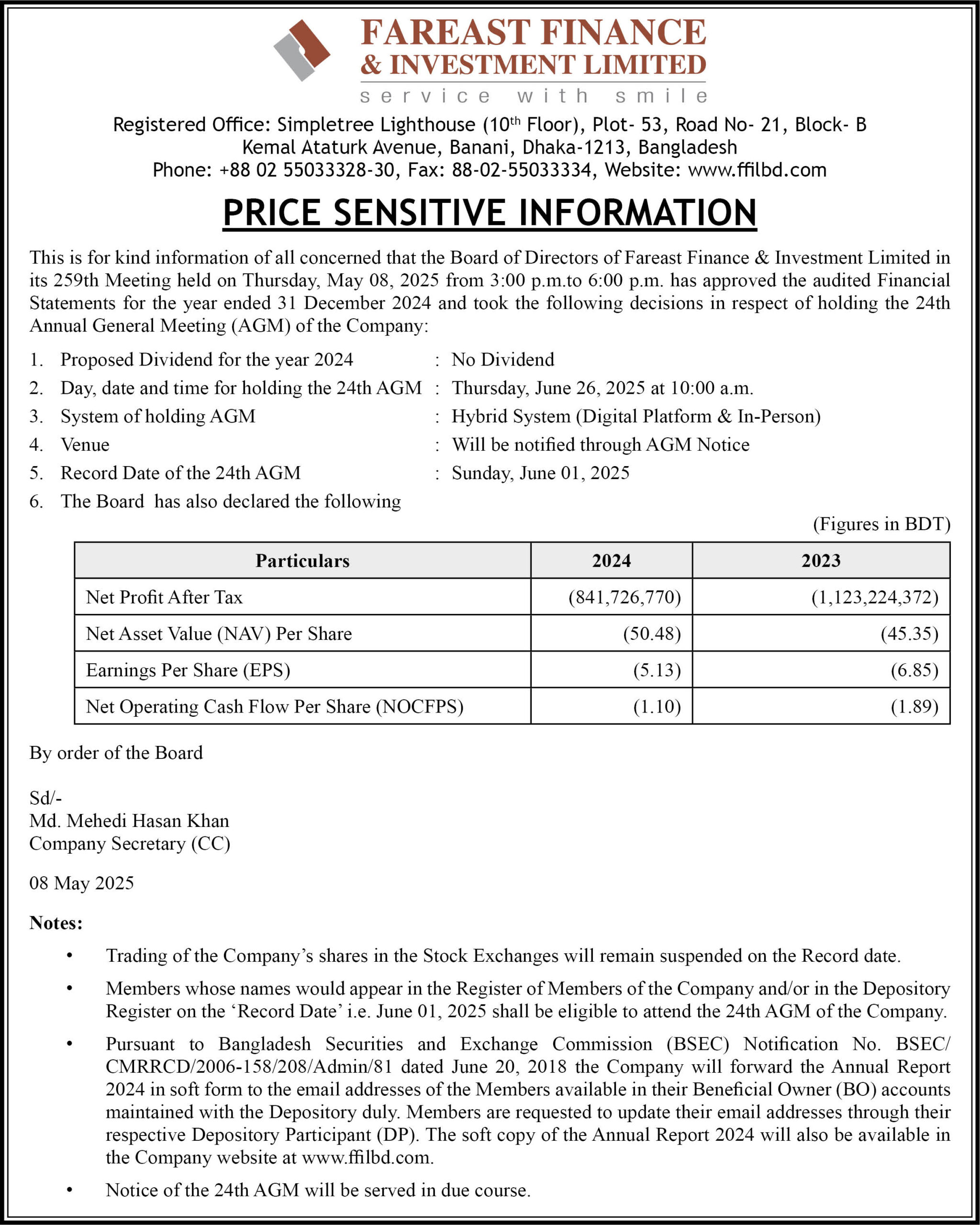 Price Sensitive Information regarding 24th AGM of Fareast Finance & Investment Ltd.