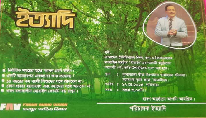 এদিকে ইত্যাদি’র আয়োজনকে ঘিরে ঝিনাইদহ জেলা সহ আশেপাশের জেলা উপজেলায় ব্যাপক উৎসাহ উদ্দীপনার সৃষ্টি হয়েছে। স্বচক্ষে ইত্যাদি দেখতে অধির আগ্রহে আছেন স্থানীয়রা।
