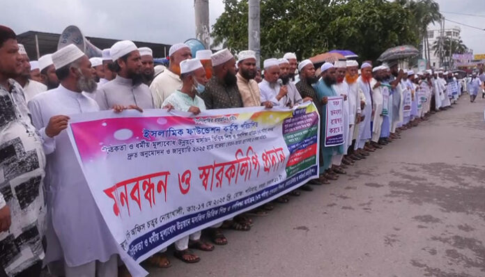নোয়াখালী প্রতিনিধি: নোয়াখালীতে ধর্ম বিষয়ক মন্ত্রণালয়ের আওতাধীন “নৈতিকতা ও ধর্মীয় মূল্যবোধ উন্নয়নে মসজিদভিয়িক শিশু ও গণশিক্ষা কার্যক্রম” (৮ম পর্যায়) প্রকল্প দ্রুত অনুমোদন এবং ঈদের আগে বকেয়া বেতন পরিশোধের দাবিতে মানববন্ধন করা হয়েছে।