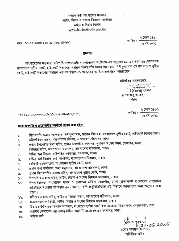 বুধবার (২১ মে) রাষ্ট্রপতির আদেশক্রমে আইন ও বিচার বিভাগ ওই বিচারপতি অপসারণ সংক্রান্ত এক প্রজ্ঞাপন জারি করে। আইন ও বিচার বিভাগের সচিব শেখ আবু তাহের প্রজ্ঞাপনে সই করেন।