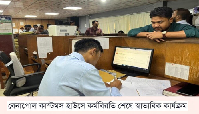 মনির হোসেন, বেনাপোল প্রতিনিধি: দীর্ঘ ১২ দিন পর কাজে যোগ দিয়েছেন বেনাপোল কাস্টমসের কর্মকর্তা-কর্মচারীরা,সরকারের আশ্বাস পাওয়ার পর।