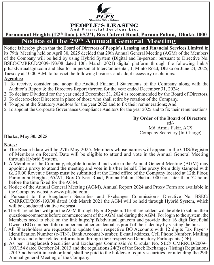 Homeপ্রাইস সেনসিটিভ ইনফরমেশনNotice of the 29th Annual General Meeting of People's Leasing and Financial...