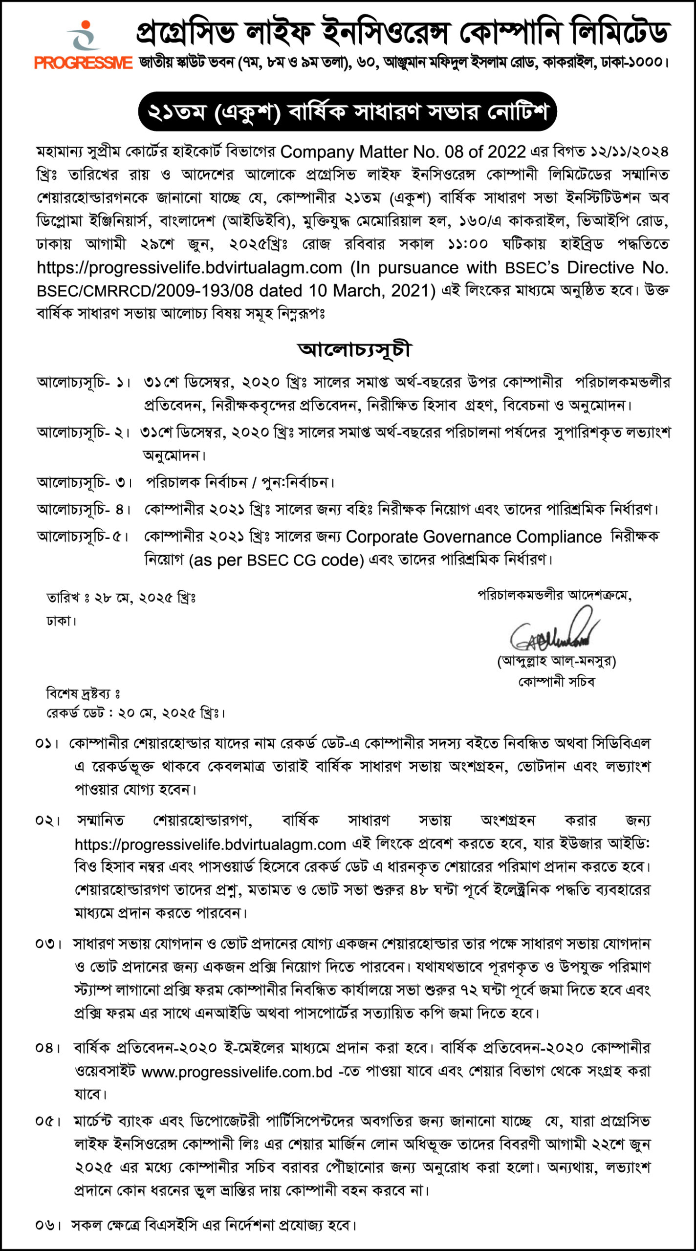 Notice of the 21st Annual General Meeting of Progressive Life Insurance Company Ltd.