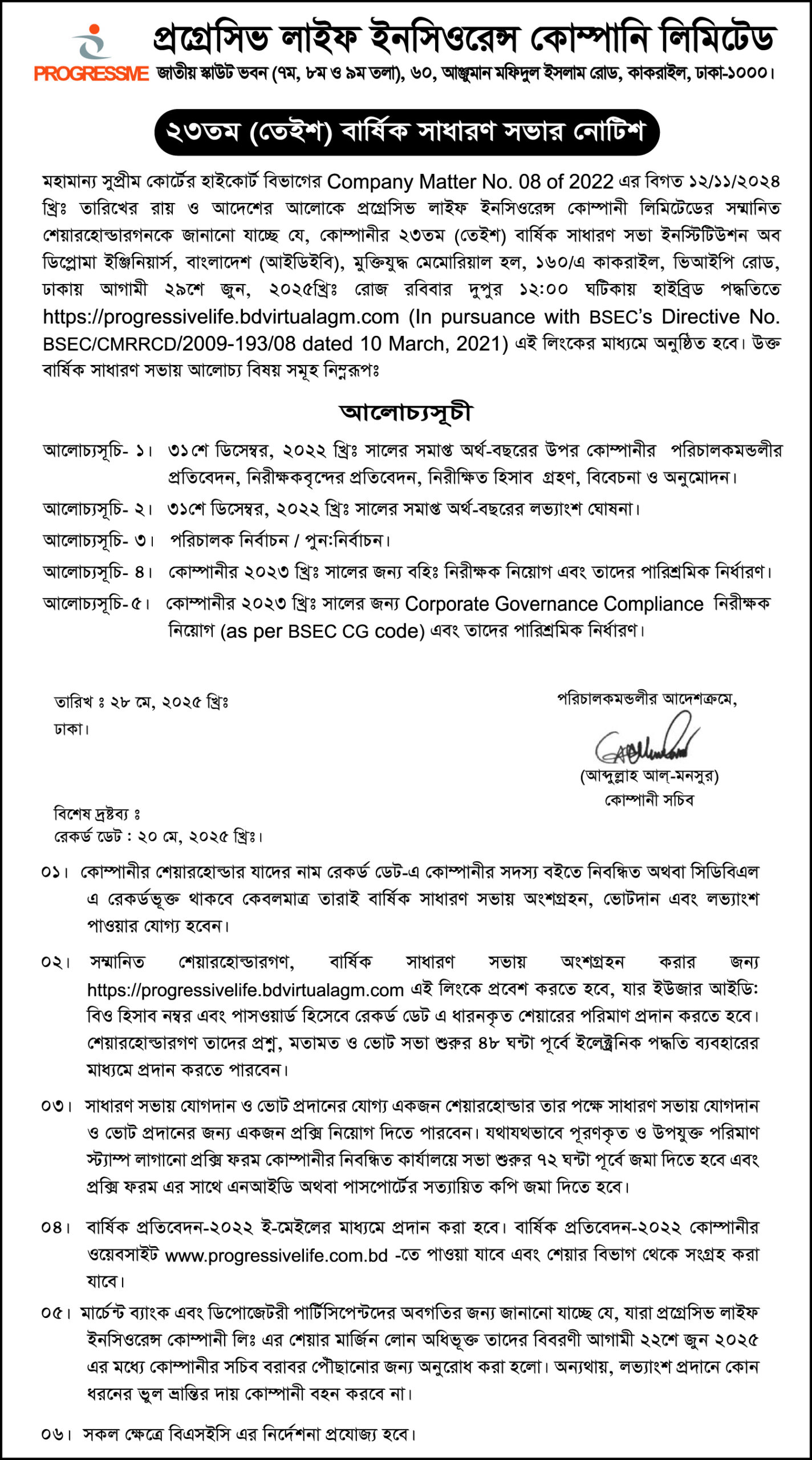 Homeপ্রাইস সেনসিটিভ ইনফরমেশনNotice of the 23rd Annual General Meeting of Progressive Life Insurance Company...