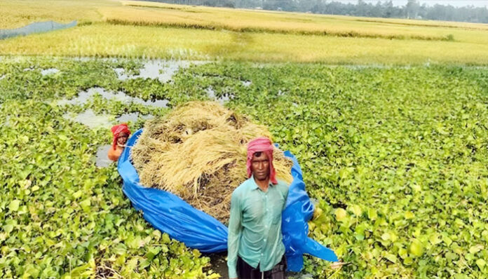 বুধবার (১১ জুন) সরেজমিন ঘুরে দেখা গেছে, নিম্নাঞ্চলের অনেক জমিতে কোমরসমান পানি জমে আছে। অধিকাংশ কৃষকের ধান এখনও কাটেনি। ফলে জমির ধান পচে যাওয়ার শঙ্কা দেখা দিয়েছে। আবার পানির মধ্যে ধান কাটতে খরচও বেড়েছে কয়েকগুণ।