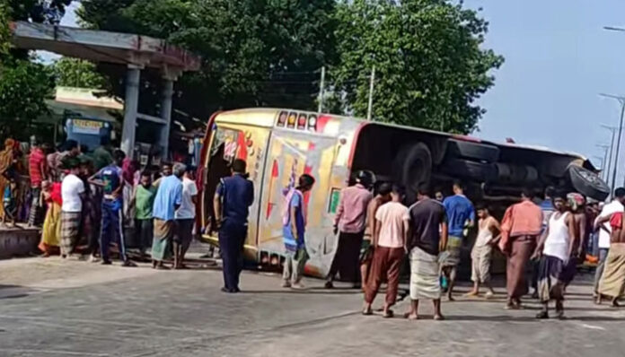 ময়মনসিংহ কোতোয়ালি মডেল থানার ভারপ্রাপ্ত কর্মকর্তা (ওসি) মোঃ ফিরোজ হোসেন বলেন, জুনায়েদ এক্সপ্রেস নামের যাত্রীবাহী বাসটি শেরপুর থেকে ছেড়ে এসে ঢাকার দিকে যাচ্ছিল। সকাল পৌনে ৮টার দিকে চায়না মোড় এলাকায় গ্যাসলিন ফিলিং স্টেশনের সামনে পর্যন্ত আসতেই গাড়িটি নিয়ন্ত্রণ হারিয়ে সড়কে থাকা ডিভাইডারের ওপরে উঠে ডিভাইডার ভেঙে সড়কে উল্টে যায়। এ সময় ঘটনাস্থলেই বাসের হেলপার মঞ্জুরুল হাসান মারা যান। এতে আহত হয়েছেন অন্তত ১৯ জন যাত্রী। স্থানীয় লোকজন আহতদের উদ্ধার করে ময়মনসিংহ মেডিকেল কলেজ হাসপাতালে পাঠিয়েছেন।