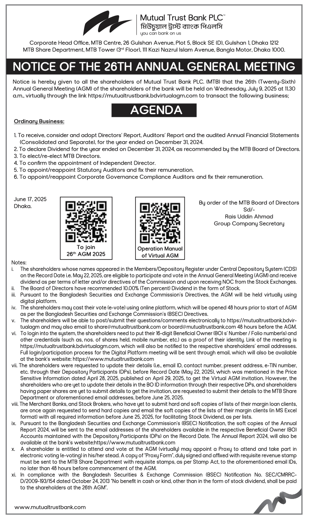 Homeপ্রাইস সেনসিটিভ ইনফরমেশনNotice of the 26th Annual General Meeting of Mutual Trust Bank PLC