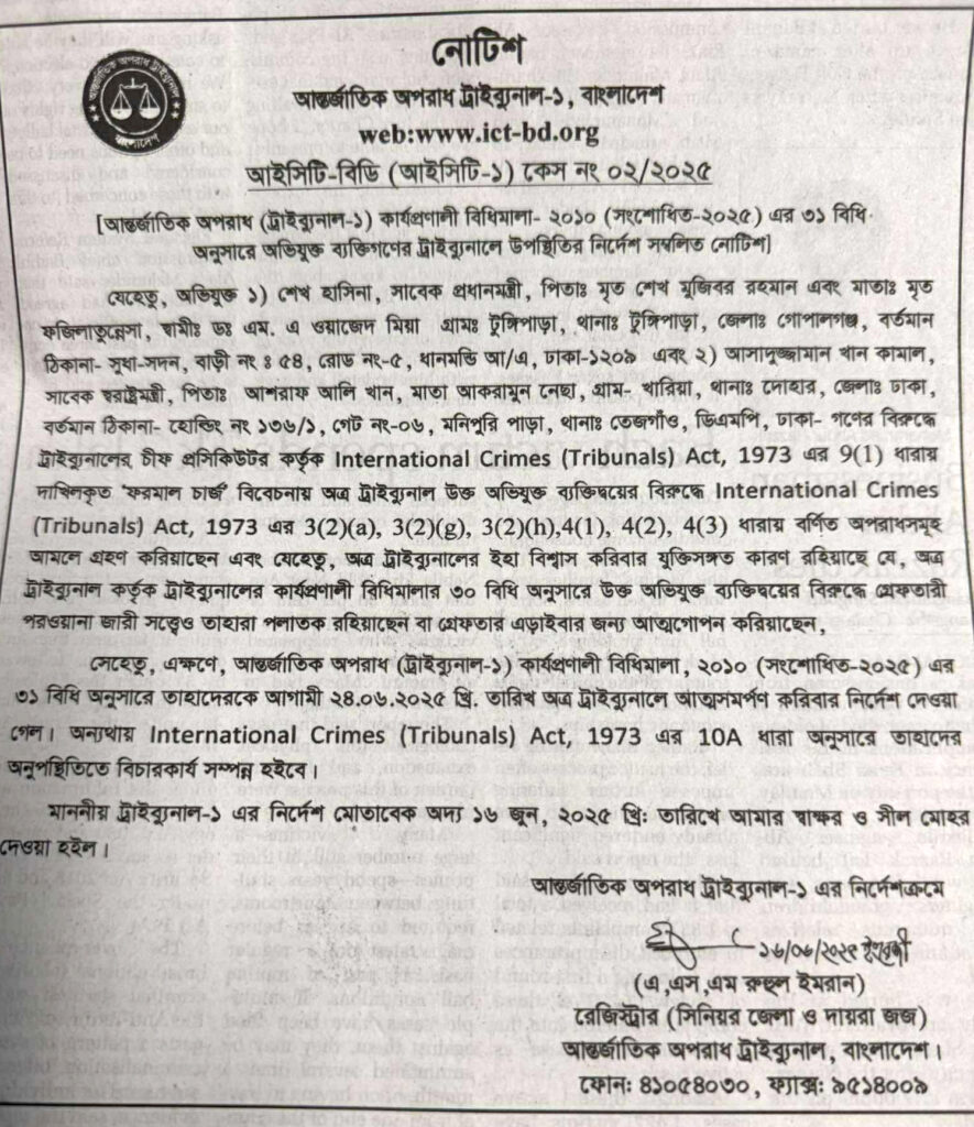 মঙ্গলবার (১৭ জুন) এ বিজ্ঞপ্তি জারি করেন ট্রাইব্যুনালের রেজিস্ট্রার।