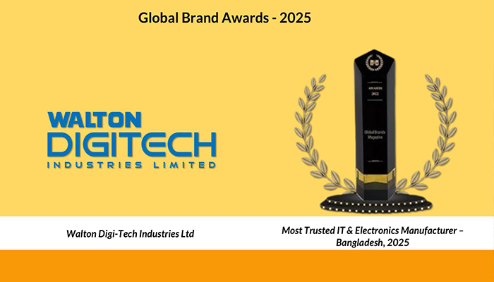 স্থানীয় বাজারে ক্রমবর্ধমান চাহিদার পাশাপাশি প্রযুক্তিপণ্যে মান, উদ্ভাবন এবং গ্রাহক সন্তুষ্টি নিশ্চিত করতে ওয়ালটনের অব্যাহত প্রচেষ্টা তাদেরকে দেশের অন্যতম নির্ভরযোগ্য ব্র্যান্ড হিসেবে প্রতিষ্ঠিত করেছে। এরই প্রেক্ষিতে ‘মোস্ট ট্রাস্টেট আইটি অ্যান্ড ইলেকট্রনিক্স ম্যানুফ্যাকচারার’ ক্যাটাগরিতে ‘গ্লোবাল ব্র্যান্ড অ্যাওয়ার্ড’ এ ভূষিত হয়েছে ওয়ালটন ডিজি-টেক। একইসাথে প্রতিষ্ঠানটির চিফ বিজনেস অফিসার তৌহিদুর রহমান রাদ এবার গ্লোবাল ব্র্যান্ডস ম্যাগাজিনের লিডারশিপ ক্যাটাগরিতে ‘মোস্ট ইনোভেটিভ চিফ বিজনেস অফিসার’ পুরস্ক পেয়েছেন।