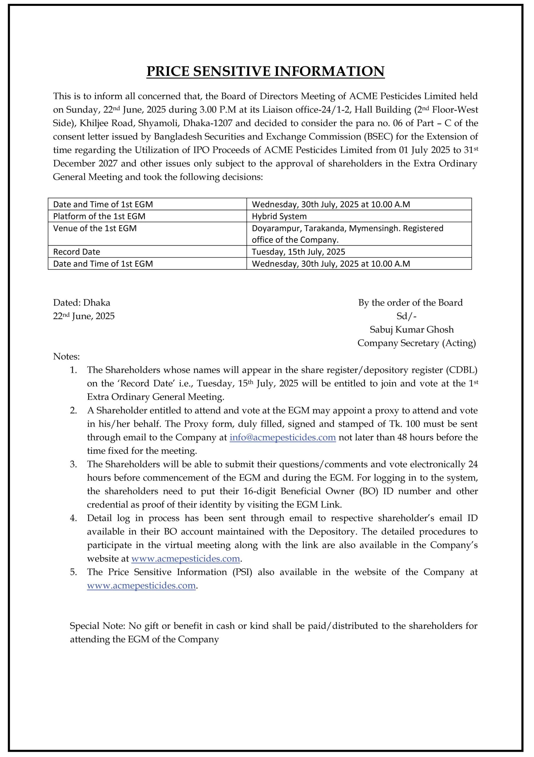 Homeপ্রাইস সেনসিটিভ ইনফরমেশনPrice Sensitive Information of ACME Pesticides Ltd.