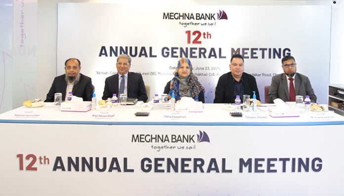 কর্পোরেট ডেস্ক: মেঘনা ব্যাংক পিএলসি-এর ১২তম বার্ষিক সাধারণ সভা (AGM) সোমবার (২৩ জুন) মেডোনা টাওয়ার, ২৮ বীর উত্তম একে খন্দকার রোড, মহাখালী সি /এ, ঢাকা ১২১২ অনুষ্ঠিত হয়। সভায় সভাপতিত্ব করেন ব্যাংকের সম্মানিত চেয়ারপার্সন মিসেস উজমা চৌধুরী।