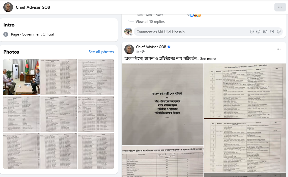 এতে বলা হয়, বিগত সরকারের ১৬ বছরে দেশের ৯৭৭টি অবকাঠামো ও প্রতিষ্ঠানের নাম সাবেক প্রধানমন্ত্রী শেখ হাসিনা, তার পরিবার ও আওয়ামী লীগের রাজনীতিবিদদের নামে প্রতিষ্ঠিত হয়েছিল। এরমধ্যে রয়েছে সেনানিবাস, বিমানঘাঁটি, নৌ-বাহিনীর জাহাজ, মেগাসেতু, সড়ক, স্থাপনা, স্কুল, কলেজ, বিশ্ববিদ্যালয়, হাসপাতাল, গবেষণাকেন্দ্রসহ বিভিন্ন প্রতিষ্ঠান।