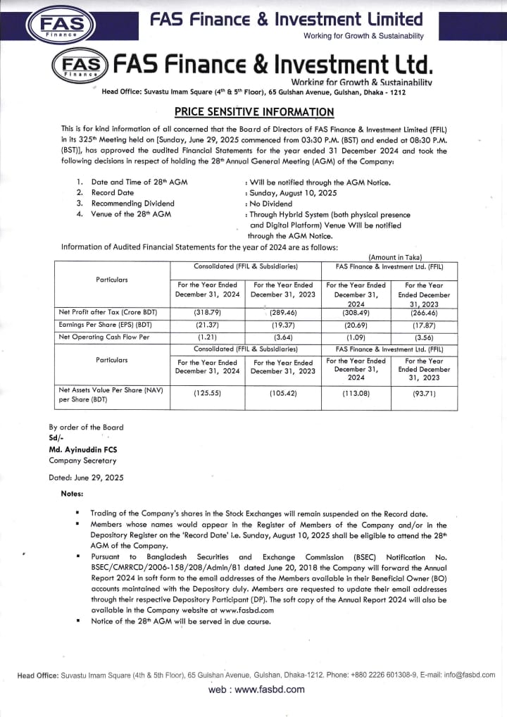 Homeপ্রাইস সেনসিটিভ ইনফরমেশনPrice Sensitive Information of FAS Finance & Investment Ltd.
