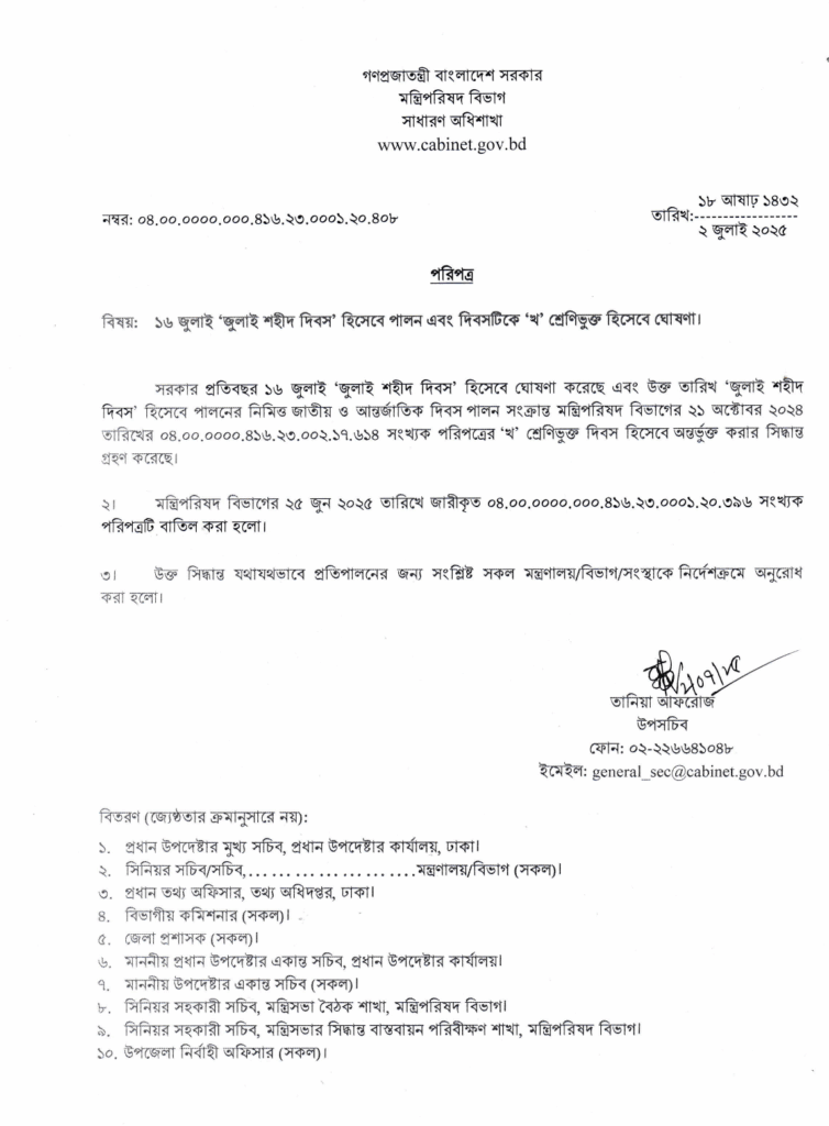 এছাড়া ১৬ জুলাইকে ‘জুলাই শহিদ দিবস’ পালনের বিষয়ে জারি করা পরিপত্রে বলা হয়েছে, সরকার প্রতিবছর ১৬ জুলাই ‘জুলাই শহিদ দিবস’ হিসেবে ঘোষণা করেছে এবং এদিন ‘জুলাই শহিদ দিবস’ হিসেবে পালনের নিমিত্ত জাতীয় ও আন্তর্জাতিক দিবস পালন সংক্রান্ত মন্ত্রিপরিষদ বিভাগের ২১ অক্টোবর, ২০২৪ তারিখের পরিপত্রের ‘খ’ শ্রেণিভুক্ত দিবস হিসেবে অন্তর্ভুক্ত করার সিদ্ধান্ত নিয়েছে।