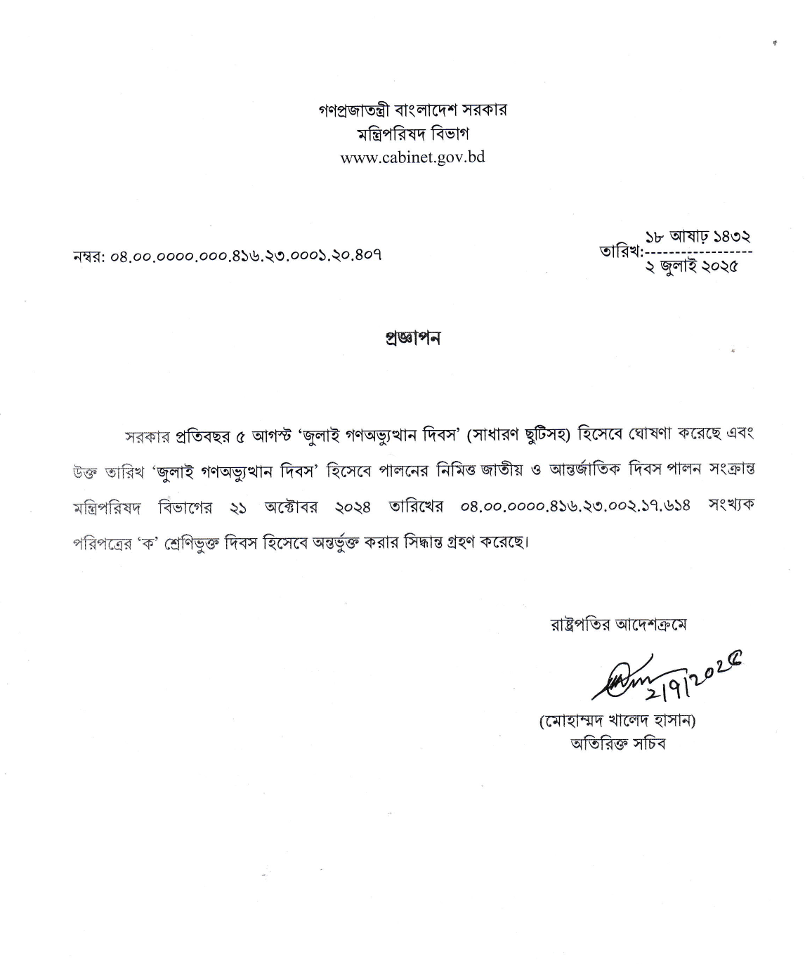 প্রজ্ঞাপনে বলা হয়েছে, প্রতিবছর ৫ আগস্টকে ‘জুলাই গণঅভ্যুত্থান দিবস’ (সাধারণ ছুটিসহ) হিসেবে ঘোষণা করেছে সরকার।