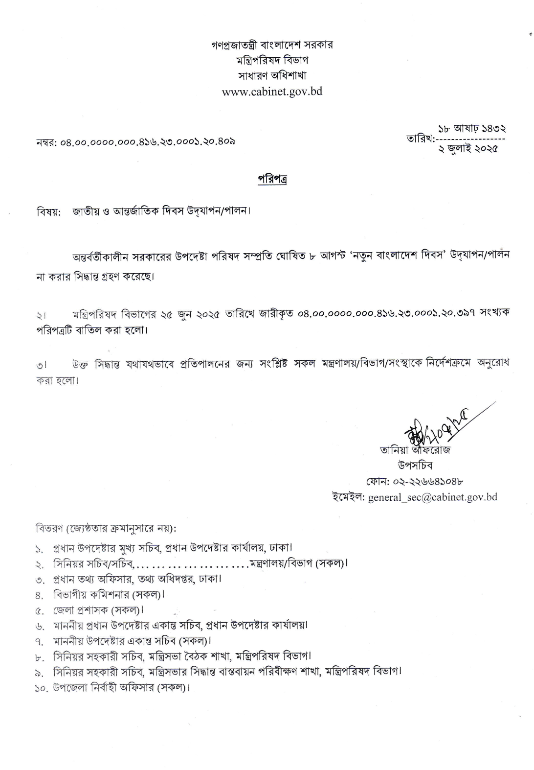 এদিকে ৮ আগস্টকে ‘নতুন বাংলাদেশ দিবস’ পালন না করার বিষয়ে মন্ত্রিপরিষদ বিভাগ থেকে জারি করা পরিপত্রে বলা হয়েছে, অন্তর্বর্তীকালীন সরকারের উপদেষ্টা পরিষদ সম্প্রতি ঘোষিত ৮ আগস্ট ‘নতুন বাংলাদেশ দিবস’ উদ্যাপন বা পালন না করার সিদ্ধান্ত গ্রহণ করেছে। এ বিষয়ে মন্ত্রিপরিষদ বিভাগের ২৫ জুনের জারিকৃত পরিপত্রটি বাতিল করা হলো। এই সিদ্ধান্ত যথাযথভাবে প্রতিপালনের জন্য সংশ্লিষ্ট সব মন্ত্রণালয়, বিভাগ ও সংস্থাকে নির্দেশক্রমে অনুরোধ জানানো হয়েছে।